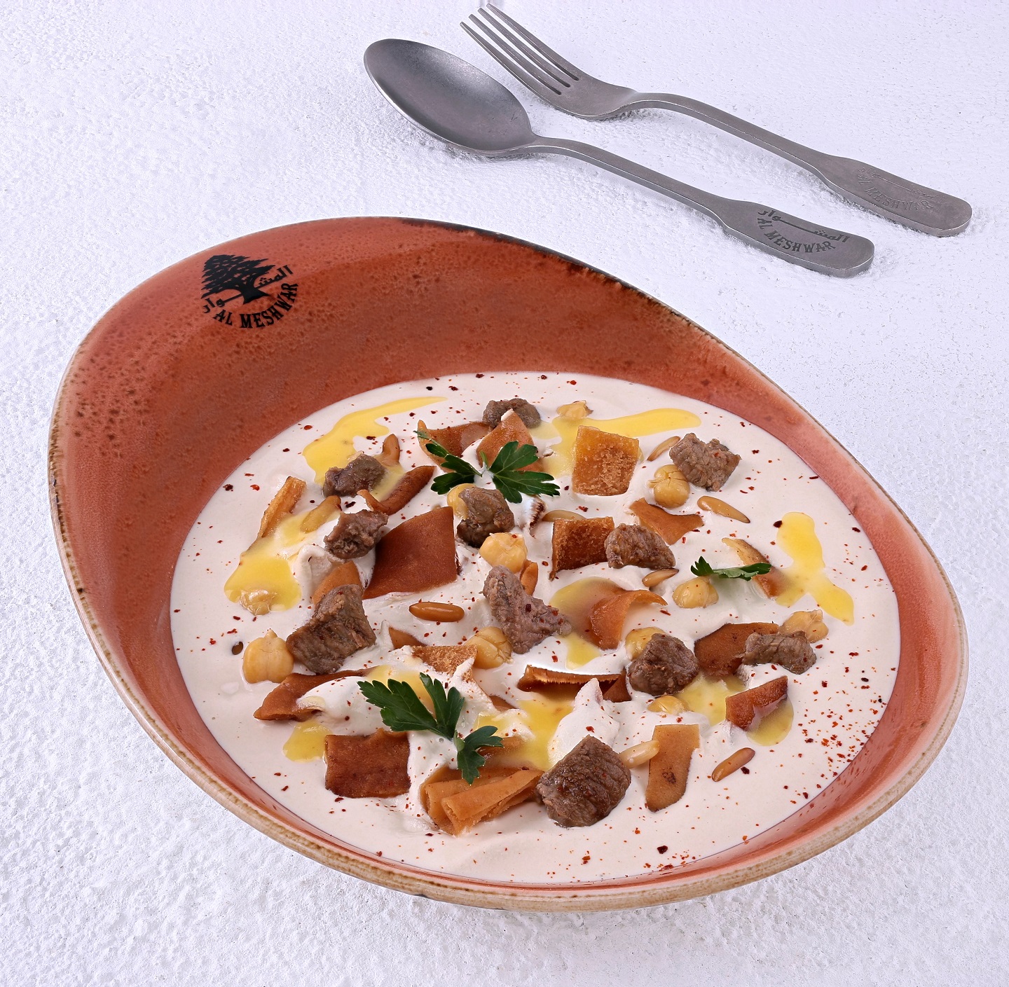 Chickpeas, Lamb Meat, Tahini, Garlic, Pine Seeds, Fried Bread and Ghee / حمص, لحمة, طحينة, ثوم, صنوبر, خبز مقلي, سمنة