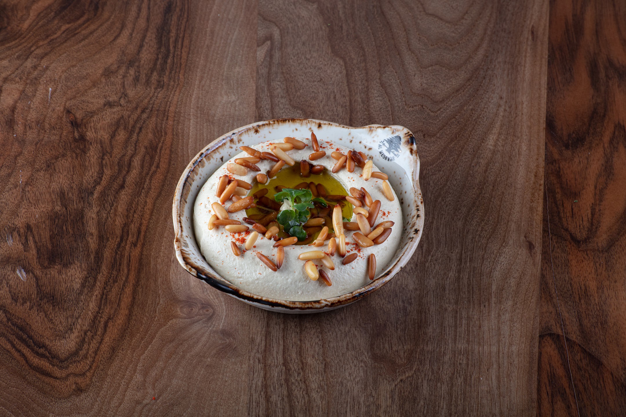 Paste of Chickpeas, Tahini, topped with sautéed Pine Seeds and Olive Oil / حمص بالطحينة, صنوبر مقلي, زيت زيتون